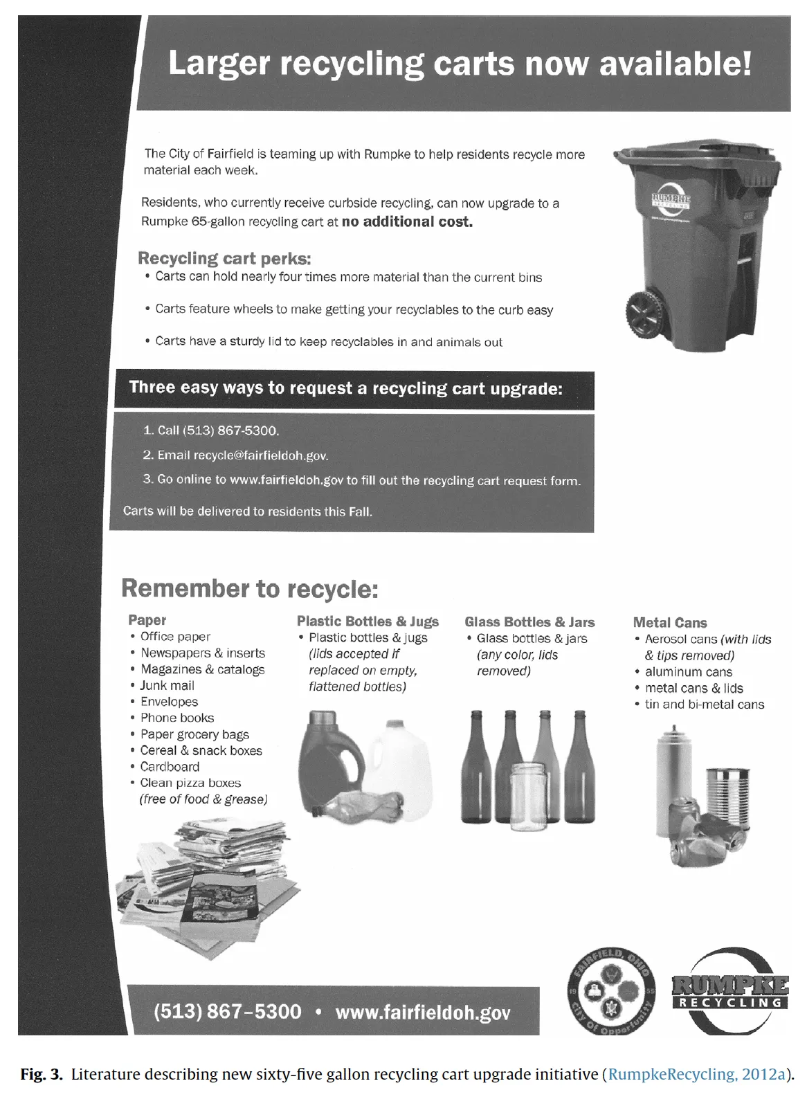 Varotto A, Spagnolli A. ‘Psychological strategies to promote household recycling. A systematic review with meta-analysis of validated field interventions’. Journal of Environmental Psychology. 51, 168-188. [DOI]. [36 studies reporting 70 interventions revealed that social modeling and environmental alterations were the most effective techniques.]. Dupré M, Meineri S. ‘Increasing recycling through displaying feedback and social comparative feedback’. Journal of Environmental Psychology. 48, 101-107. [DOI]. [The results suggest that publicly displayed social comparative feedback can improve recycling behaviors.]. • Figure 3![]() Miliute-Plepiene J, Hage O, Plepys A, Reipas A. ‘What motivates households recycling behaviour in recycling schemes of different maturity? Lessons from Lithuania and Sweden’. Resources, Conservation and Recycling. 113, 40-52. [DOI]. [Social norms were found to be important for source sorting in the early-stage recycling system but not in the mature recycling system]. Oke A, Kruijsen J. ‘The Importance of Specific Recycling Information in Designing a Waste Management Scheme’. Recycling. 1, 271-285. [DOI]. [A holistic approach in designing recycling information using 15 expert-based (in-depth) interviews. Five questions: what, where, when + why and how.] Rousta K, Bolton K, Dahlén L. ‘A Procedure to Transform Recycling Behavior for Source Separation of Household Waste’. Recycling. 147–165. [DOI]. [A four step recycling behavior transition procedure enables continued improvement of waste sorting behavior in any household waste collection system that includes waste sorting at the source.] • Figure 8![]() Willman KW. ‘Information sharing and curbside recycling: A pilot study to evaluate the value of door-to-door distribution of informational literature’. Resources, Conservation and Recycling. 104, 162-171. [DOI]. [USA: A simple door-to-door delivery of literature could be done at low cost and should be effective for communicating improvements to curbside recycling programs and other community initiatives where resident action is desired.] • Figure 3
