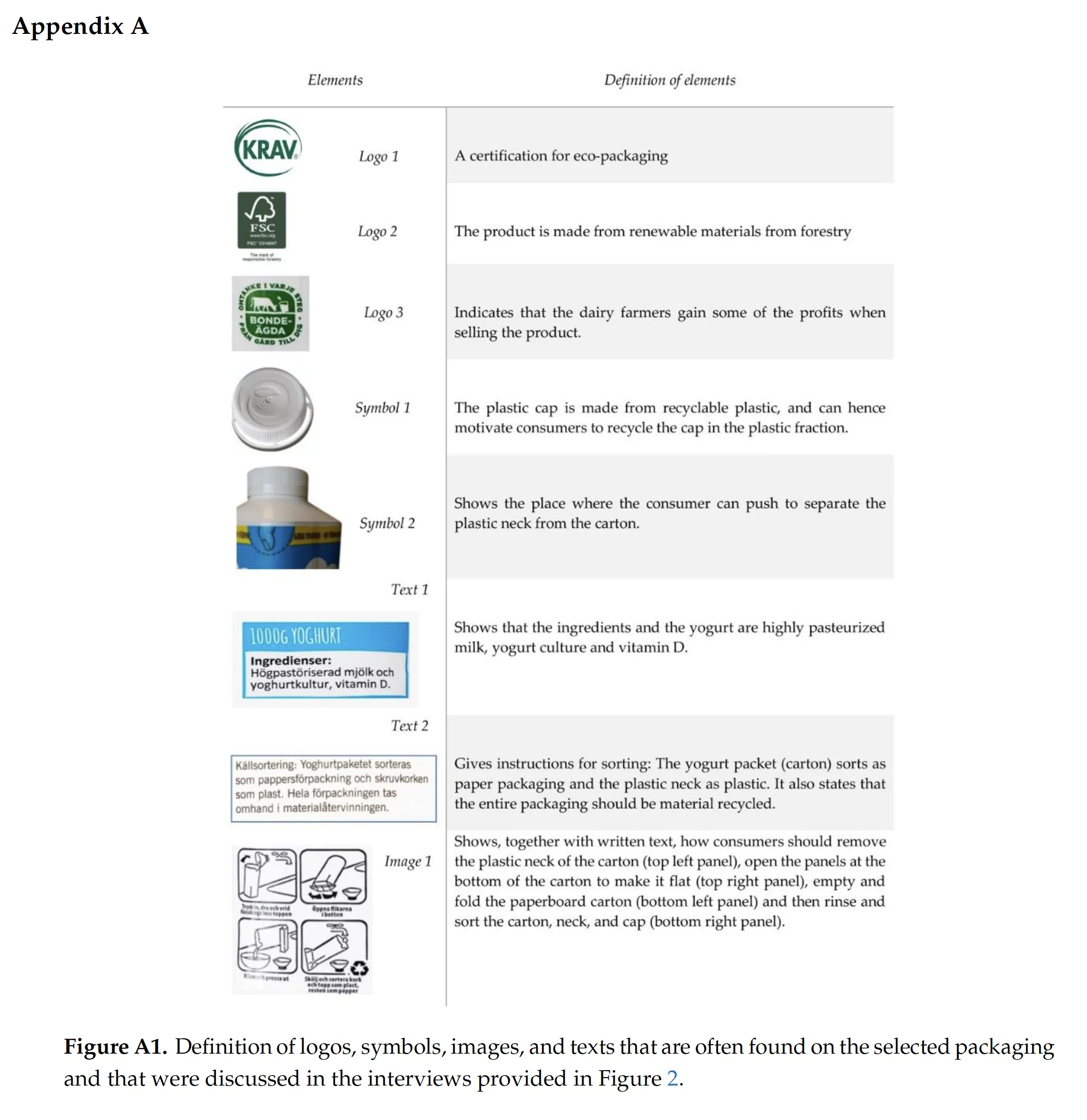 Janßen D, Langen N. ‘The bunch of sustainability labels e Do consumers differentiate?’. Journal of Cleaner Production. 143, 1233-1245. [DOI]. [Germany, milk. Online hypothetical choice experiment. 787 participants. No illustrations]. No figures.Rousta K, Ordoñez I, Bolton K, Dahlén L. ‘Support for designing waste sorting systems: A mini review’. Waste Management & Research. 35(11), 1099-1111. [DOI]. [Convenience (adequate access to sorting facilities, good service, etc.) and knowledge and information are the most relevant factors that encourage waste sorting in households.]. Steenis ND, Herpen E van, Lans IA van der, Ligthart TN, Trijp HCM van. ‘Consumer response to packaging design: The role of packaging materials and graphics in sustainability perceptions and product evaluations’. Journal of Cleaner Production. 162, 286-298. [DOI]. [Student sample rely on misleading, inaccurate lay beliefs to judge packaging sustainability and are therefore susceptible to making ineffective environmental decisions. Student samples' sustainability assessments are also highly influenced by mere graphical packaging cues that have no obvious actual sustainability consequences.]. • Appendix